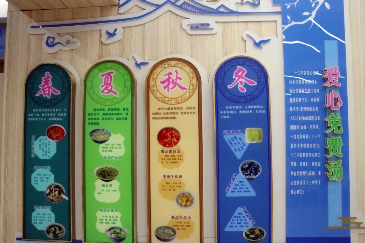 热腾腾的免费汤氤氲着暖意,带来十三年如一日的坚持与守候。汤方随节令变化,春滋补、夏清火、秋润燥、冬驱寒,一碗热汤里藏着四季的关怀,也浸润着学校对学子无微不至的守护。