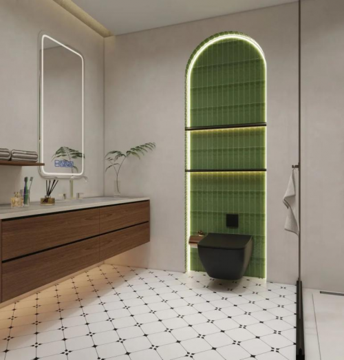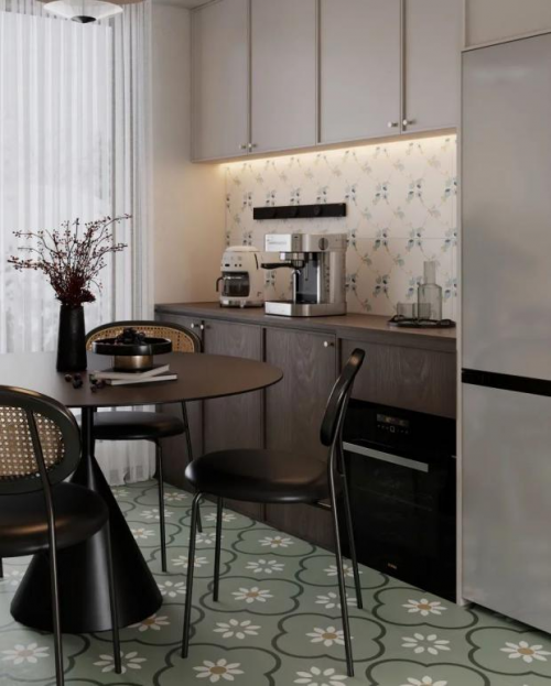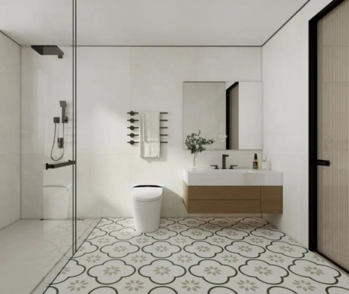 而“绿野清韵”则以低饱和度的淡绿色调为主,汲取西班牙摩尔复兴建筑中的经典四叶纹样,赋予空间清新、宁静的生命力。这款花砖适用于卫生间、阳台、玄关等多种场景,其温和的视觉感受能有效缓解都市生活的紧张节奏,为空间注入如林间薄雾般的舒缓气息,是现代轻奢与中古风格家居的理想选择。