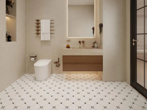“南法假日”系列则将法国南部小镇的慵懒风情融入设计之中。粗粝石墙、手作陶罐与碎花布艺的意象被提炼为极简线条与抽象花卉图案,散落在砖面之上,形成自由随性的视觉节奏。搭配黑白色调墙面砖使用,既保留了田园诗意,又不失现代时尚感,让客厅或厨房充满浪漫情调。