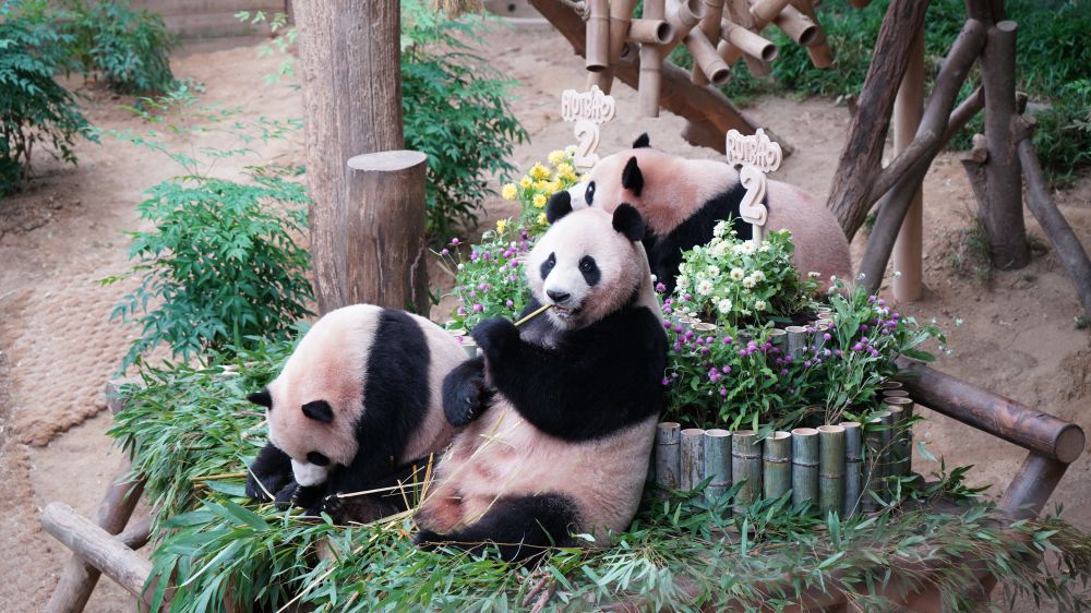 2025年7月7日,在韩国京畿道龙仁市爱宝乐园,大熊猫妈妈“爱宝”(中)和“睿宝”、“辉宝”在庆生活动上享用美食。新华社发(孙一然摄)