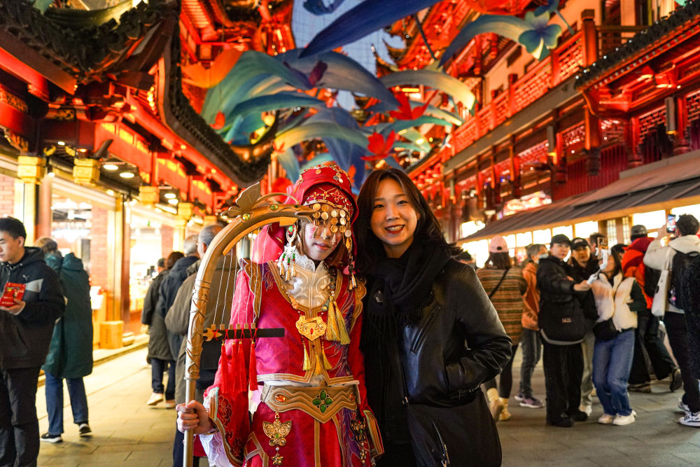 2024年11月30日,来自韩国的游客(右)在上海豫园商城与游戏角色装扮者合影。新华社发(谢鑫摄)