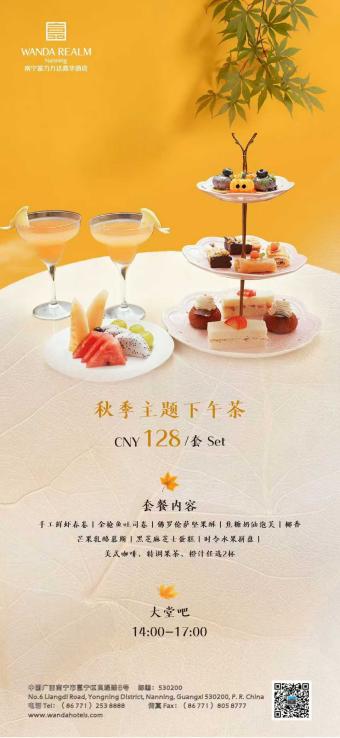 此次露营季,酒店精心筹备了丰富的餐饮选择。喜欢广式风味的食客可选择广式牛杂煲3~4人套餐,售价498元。套餐包含开胃凉菜3小碟(泡椒藕带、手拍黄瓜、泡椒鱼皮)、广式牛杂煲1份、时令有机蔬菜拼盘、广式干炒牛河、秘制酱料4份、邕宁时令水果拼盘以及软饮(可乐、雪碧、芬达、手打柠檬茶、蜂蜜水果茶5选4),让食客在露营中尽享广式美味的醇厚。 若偏爱精致下午茶,酒店大堂吧推出的秋季主题下午茶套餐不容错过,每套128元,供应时间为14:00-17:00。套餐包含手工鲜虾春卷、金枪鱼吐司卷、佛罗伦萨坚果酥、焦糖奶油泡芙、椰香芒果乳酪慕斯、黑芝麻芝士蛋糕、时令水果拼盘,搭配美式咖啡、特调果茶、橙汁任选2杯,为秋日午后增添一份甜蜜与惬意。