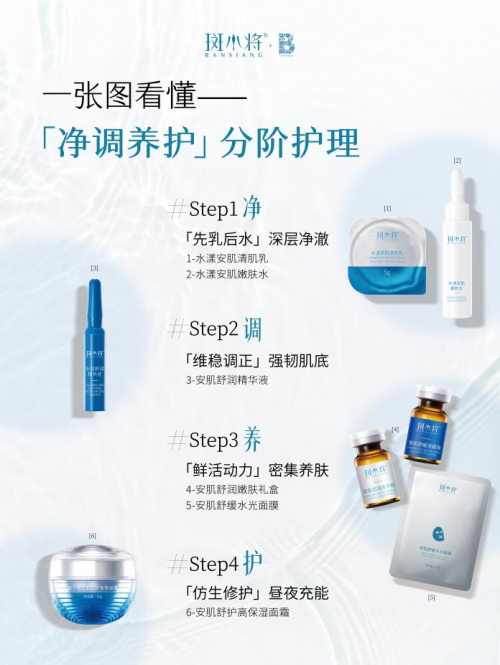 服务的非标化是美业拓张的痛点。斑小将通过“流程化”来解决这一问题。品牌为水漾安肌系列设定了清晰的“净、调、养、护”四步护理哲学,并据此衍生出“水光灌注护理”与“冻干瀑布护理”两个标准品项。