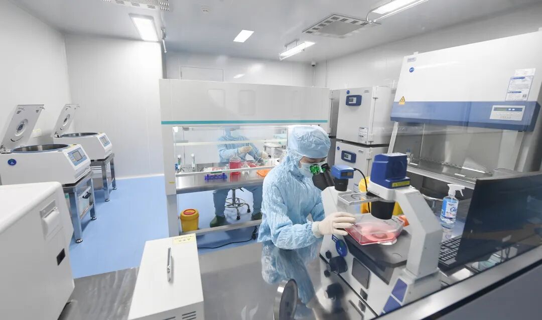 欧创柯亿细胞制备中心的洁净区内,技术人员正在认真观察细胞培养生长状态。记者白永民摄