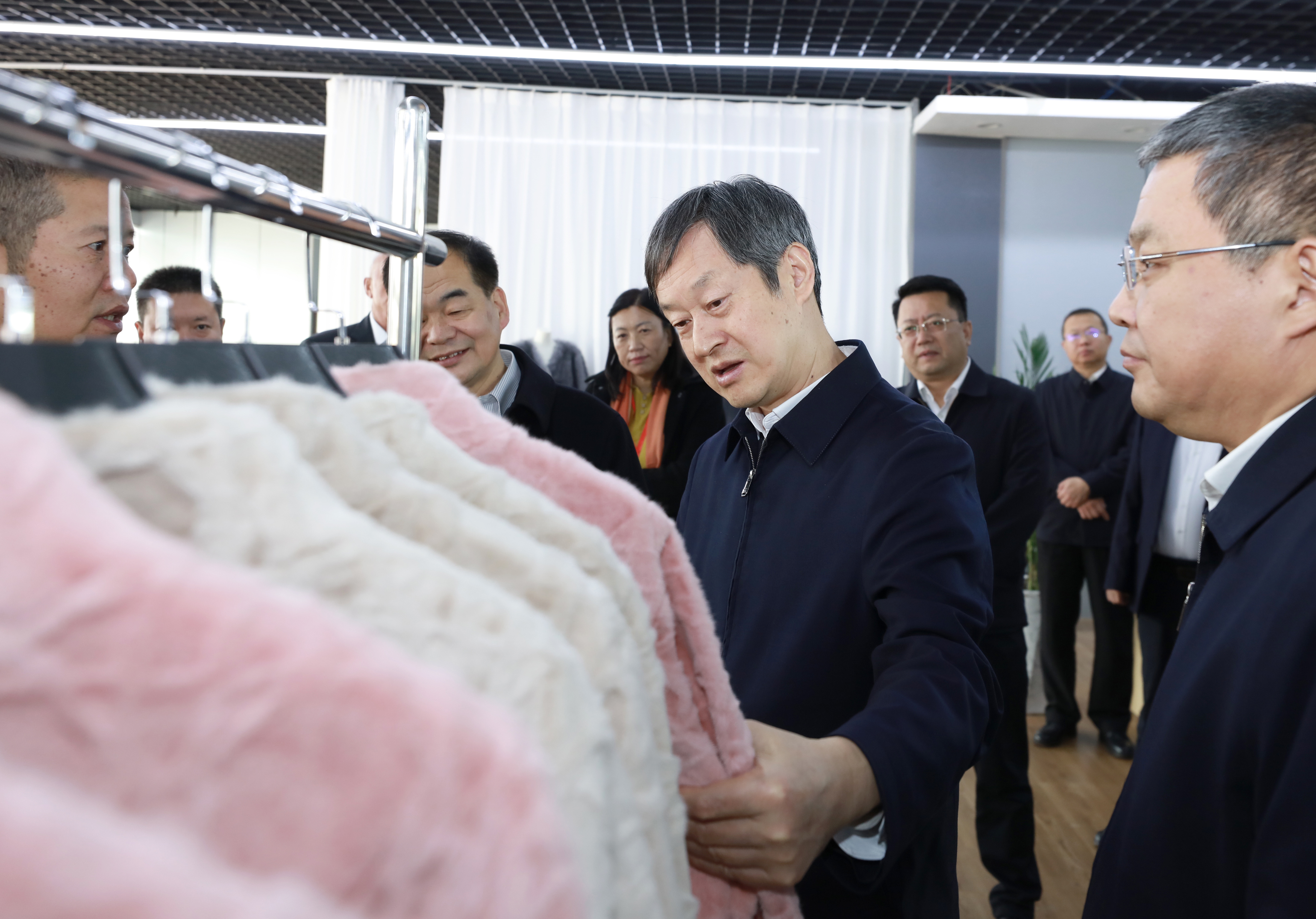随后,吴晓华到枣强县裘皮设计创新中心、电商基地和河北省毛皮服装加工产品质量检验检测中心,实地了解产业转型升级进展情况。他强调,要深入学习贯彻党的二十届四中全会精神,坚持智能化、绿色化、融合化方向,以更大力度推动皮毛产业转型升级、提质增效。要建立数字化平台,通过引入AI技术、加强大数据分析,推进设计、生产、销售各环节智能化升级,为消费者提供高端化、个性化的消费体验。要发挥质检中心职能作用,探索建立一品一码质量追溯系统,构建从原料到消费者的全程可追溯体系。要深化区域公用品牌创建,发挥行业协会作用,引导企业积极参与制定地方标准、行业标准,支持优质企业做大做强,推动皮毛产业健康发展。要发展跨境电商,加快保税仓库和出口监管仓库建设,支持企业参加境内外展销活动,开拓国际国内“两个市场”。要继续办好大营皮草博览会,助力企业更好把握市场机遇,拓展合作空间,实现互惠共赢。