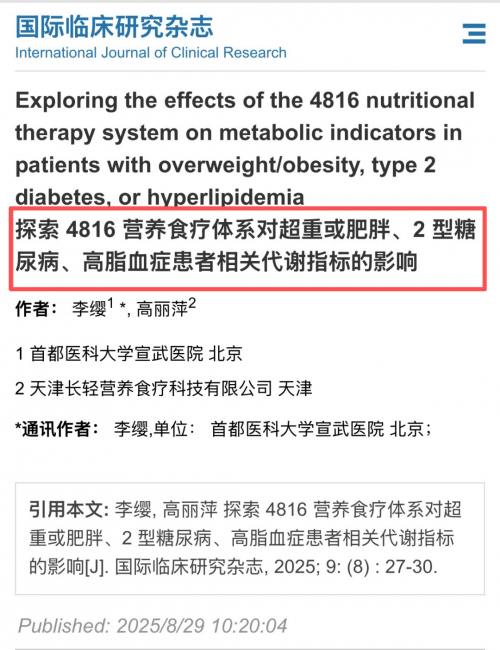 近日,一项发表于《国际临床研究杂志》的研究,为营养干预在慢性病管理中的作用提供了新的科学证据。该研究探索“4816营养食疗体系”对超重或肥胖、2型糖尿病、高脂血症患者相关代谢指标的影响。