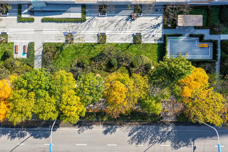 在口袋公园,少即是多,留白即是丰盈。干净利落的几何线条,勾勒出空间的节奏感,大片草坪与砾石铺陈的“呼吸地带”,让视线与心境一同舒展。植物不再是点缀,而是空间的情绪——形态鲜明的乔木、成团簇拥的灌木,以克制而精准的方式,构筑出宁静而有生命力的背景。