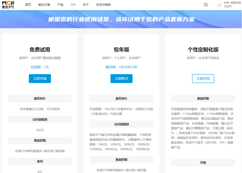根据功能规划,在墨迹天气的开发者平台选择合适的日调用量梯度(从5万/日到1000万/日不等),避免资源浪费或调用受限。