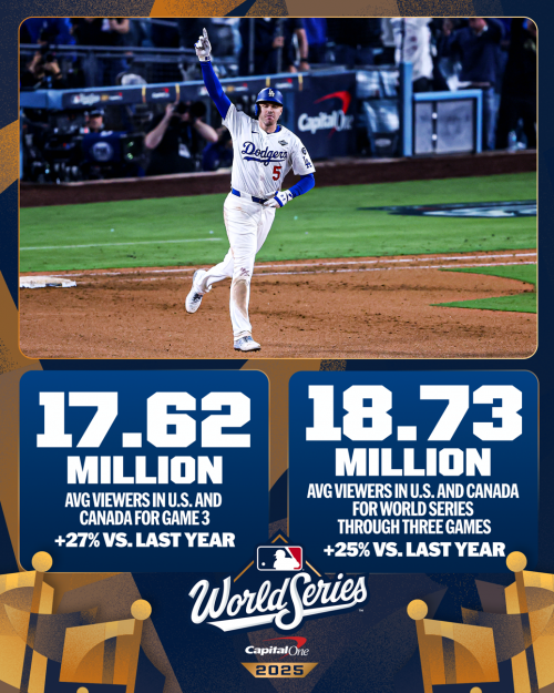 在美加两国,世界大赛前两战累计平均收视达1873万,较去年同期上涨25%;其中第三战单场更揽获1762万观众,同比激增27%,双双刷新近年收视纪录。