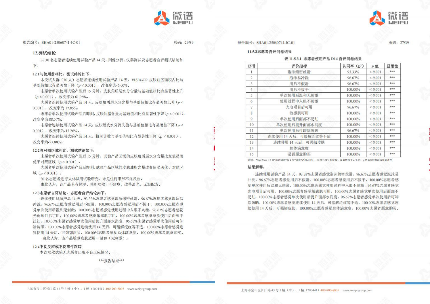 hfp出具的第三方检测报告中可以看到,33名敏感肌受试者单次使用后,面部油光减少88.57%,角质层水分增加61.96%,连续使用14天后,经皮失水减少13.26%,数量减少27.88%,即屏障更强韧、肤质更健康!