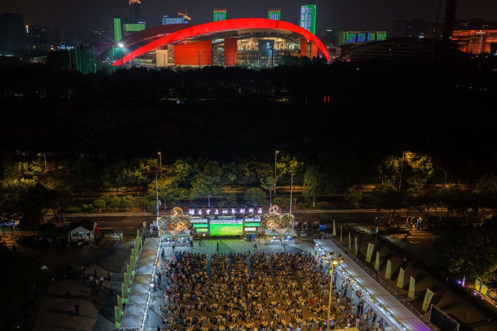 10月4日,球迷在南京市建邺区银杏里文化艺术街区的“苏超”“第二现场”观赛(无人机照片)。新华社记者 李博 摄