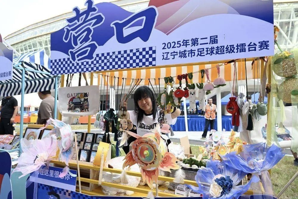 “辽超”场地旁,“辽超市集”营口摊位售卖文创等产品。