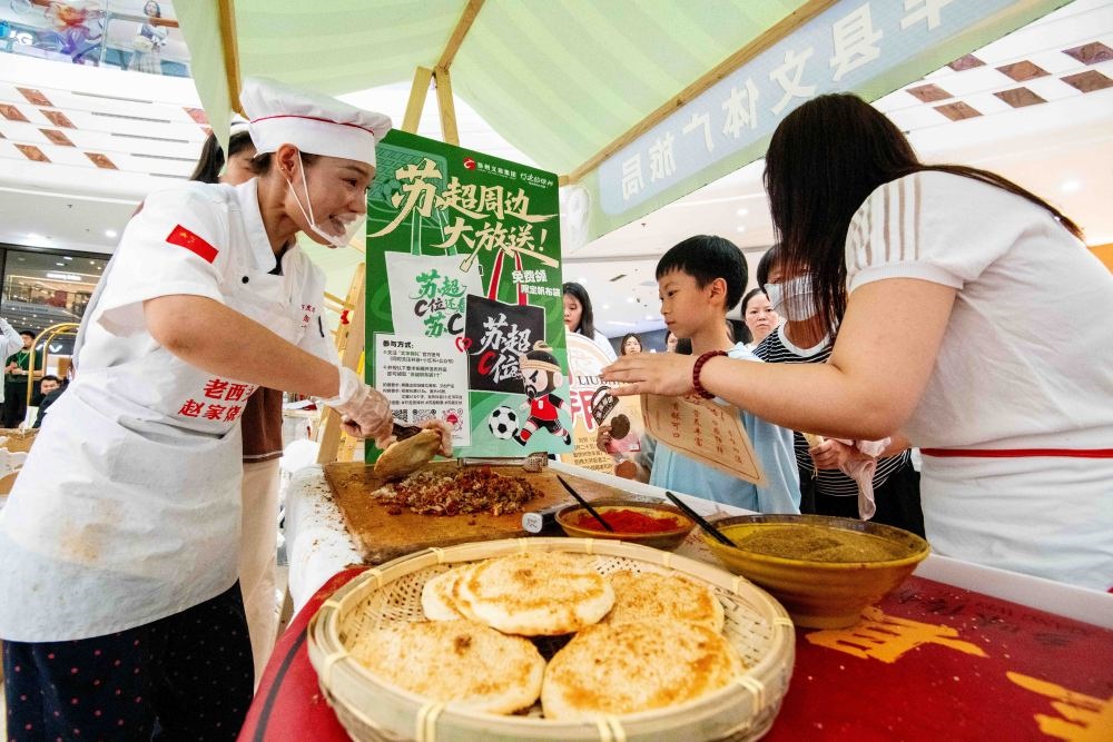 6月28日,消费者在泰州市海陵区万达广场“跟着苏超游徐州”徐州文旅(泰州)推介会上品尝食品。在“苏超”泰州队主场比赛期间,联赛各场次比赛购票观众和客场球队城市市民,均可享受泰州48家旅游景区免费入园、免费品尝泰州早茶,以及停车、住宿、购物等多项优惠。新华社发(杨玉岗 摄)