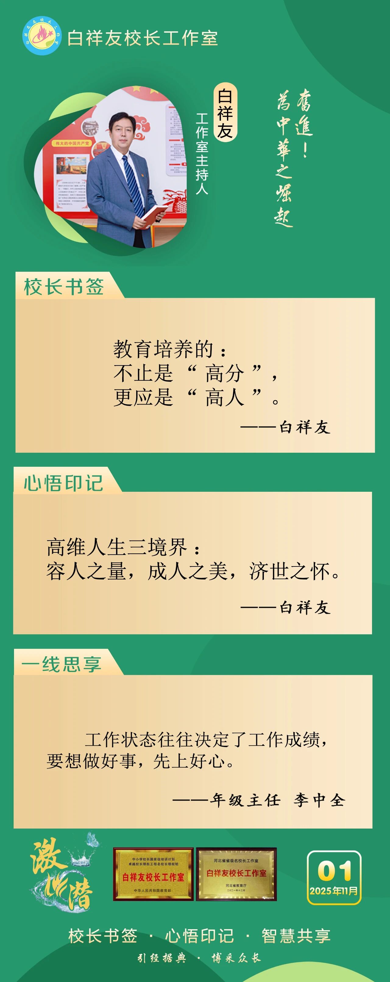 “白祥友校长工作室”成立于2019年4月,是教育部“国培计划”中小学名校长领航工程、河北省首批名校长工作室,目前省内外成员校59所。工作室坚持“资源共享、智慧共融、互助共赢”理念,已成为思想碰撞的交流场,资源共享的品牌站,成果展示的辐射源。 点赞 +1 微博 微信 我要评论 发布 相关推荐 祝贺!衡水十三中学子省赛获奖 教育大观 1天前 白祥友校长工作室成员新疆实验中学冯永庄校长一行来衡水十三中参观交流 教育大观 2天前 春日里,衡水十三中学子“抢”个痛快,“拼”出花样! 教育大观 5天前 衡水市委管理干部学习贯彻党的二十届四中全会精神研讨班开班 政情 03-19 全市一等奖!衡水十三中激潜教育再结硕果 教育大观 03-17 巾帼筑梦绽芳华 向光而行建新功 河北衡水中学举办第十八届“杰出女教师”表彰大会 资讯速递 03-09 衡水十三中学子这样追“锋”! 教育大观 03-06 马力加载,衡水十三中学子元气回归! 教育大观 03-05 热门 一天 三天 一周 1 【湖城慢直播】踏春寻梅正当时 定格衡水春日里的亮丽风景 2 【新闻发布】 创新招商促落地 深化服务提质效 衡水市持续打造投资兴业热土 3 微改革激发新活力 微创新助力大发展——衡水市扎实推进改革创新工作走深走实 4 我市全方位营造安心舒心消费环境 全年累计使用补贴资金8.3亿元 带动消费61.3亿元 5 故城:百人太极展风采 全民健身焕新颜 6 【文明旅游反面曝光】春游要文明 赏花莫“摧花” 7 故城县开展结核病防治宣传活动 8 衡水发布27个重点招商产业 聚焦县域特色精准发力 9 衡水滏阳路:美人梅盛开 繁花似锦 10 全国学雷锋活动示范点衡水公交18路队:服务不是喊口号,是把乘客没想到的提前想到 1 央媒省媒关注衡水春耕春管有序进行 2 315金融观察|交通银行:2026年以来累计被罚没超2200万元,近30天黑猫投诉平台新增超230条投诉 3 一碗免费热食 暖了衡水的烟火人间 4 深度报道|衡水商超这些年 5 赴春天之约 看杏韵花海 ——枣强县(肖张)第四届杏花文化宣传推介会掠影 6 衡水桃城区城东社区开展“世界水日”主题宣传活动 7 “入企探岗”+“直播带岗” 衡水市“春风行动”线上直播招聘活动创新出彩 8 衡水市各部门各单位有力有序开展树立和践行正确政绩观学习教育 9 河北各地各部门各单位扎实开展树立和践行正确政绩观学习教育 10 【乡村行 看振兴】“老咸菜”里的乡愁——走进武邑县冀京农粮食种植专业合作社 1 拾光纪·马年再会老朋友,上个马年他赠予习近平一匹汗血马 2 “白牌”电动自行车还能骑吗? 衡水晚报“帮办”核实:已全面禁行,违规上路会受罚 3 衡水文旅春日上新 十大场景开启沉浸式春游新体验 4 高职单招考试3月21日开考 衡水9300余名考生将参加考试 5 衡水发布七大主题线路开启春日盛宴 “湖城花事·衡水有约”诚邀京津冀游客共赴花期 6 315金融观察|大地财险罚单密集落地,暴露合规短板 7 探秘气象“大本营” 解锁防灾新密码 饶阳县气象局举办世界气象日科普开放活动 8 【新闻发布】锚定便民利企目标 衡水发布2026年自然资源营商环境新蓝图 9 【新闻发布】聚焦科技赋能 衡水绘就营商环境新图景 10 以鱼养水净河道 2万余尾草鱼苗放流滏阳河衡水市区段 广告 广告 广告 24小时 1 海报系列||早安衡水 2 时政现场说丨与雄安新区共成长 与中国式现代化同发展 3 拾光纪·“我对这里充满感情”,习近平心系燕赵大地 4 近闻·四赴雄安,对“未来之城”再部署 5 沧州银行DIY借记卡上线啦! 6 衡水发布27个重点招商产业 聚焦县域特色精准发力 7 春菜上新 衡水市区超市“鲜”意十足 8 阜城码头镇:运河岸边焕新颜 乡村颜值气质双提升 9 赴气象之约 探“风云变幻” 衡水滨湖志臻学子沉浸式解锁气象奥秘 10 河北衡水:全民健身 燃动湖城 系列之二——舞步翩跹 乐享生活