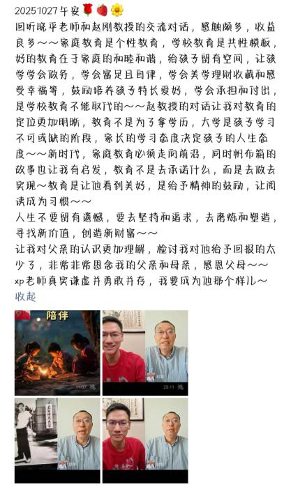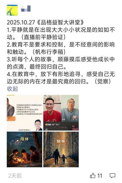 此次活动中,两位专家的分享既有理念引领,又有具体方法指导,活动后续影响力持续发酵,在“品格世界朱晓平的会员专区”里家长们分享深刻感悟。大家结合赵刚教授观点,强调家庭教育在孩子个性化成长维度的不可替代性,还被其“帆布箱的故事”触动,理解了信念引领的意义。朱晓平老师的品格教育理念也引发广泛共鸣,家长们从多方面将活动理念转化为教育行动思考,更有家长提炼教育理念,活动话题在家长群体中讨论激烈。
