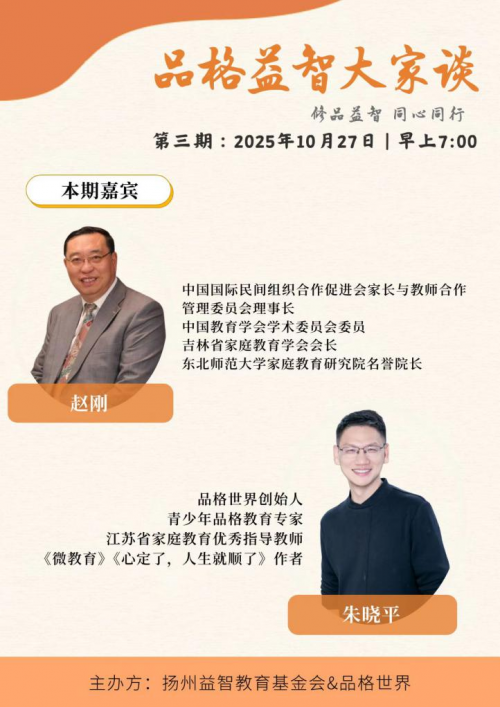 10月27日早上7:00,由扬州益智教育基金会与品格世界联合主办的“品格益智大家谈”第三期活动,在大家的期盼中拉开帷幕。本期活动聚焦家庭教育核心议题,特别邀请到深耕该领域三十余年的资深学者赵刚教授,以及品格世界创始人、青少年品格教育专家朱晓平老师,两位专家结合自身实践与研究,为4万听众带来了一场兼具理论深度与实践指导意义的家庭教育与人生成长思想盛宴。
