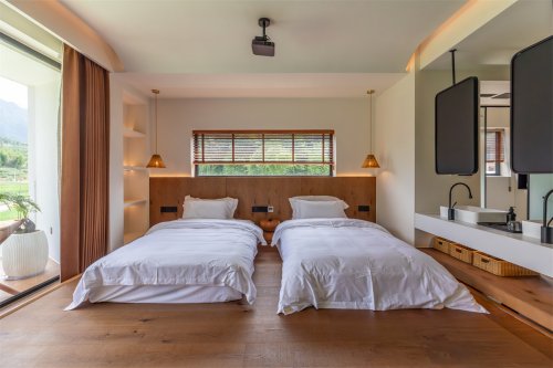 庭院景致,如同一幅无尽的长卷,无碍地铺展在眼前。它不再是窗外的风景,而是生活的一部分,是可感、可触、可拥入怀中的日常。您将感受晨光熹微的温柔唤醒,目睹暮色四合的诗意沉静,春之萌动、夏之繁茂、秋之静美、冬之素净,四时风物,皆成枕畔最珍贵的私藏。院内的三棵小树,并非随意栽种,它们是时光的引线,静默地生长,引导着人们前去,安坐其旁。在特意设置的席上,将一身尘嚣轻轻卸下。此刻,方知何为“坐拥风月”——真正的拥有,不是占有,而是心灵上的共鸣与沉浸。背靠巍峨苍山,晨起可揽流云入怀,日暮可观霞光浸染天际。在这里,山水与人文深情相拥,邀您共赴一场治愈身心的慢时光之旅。