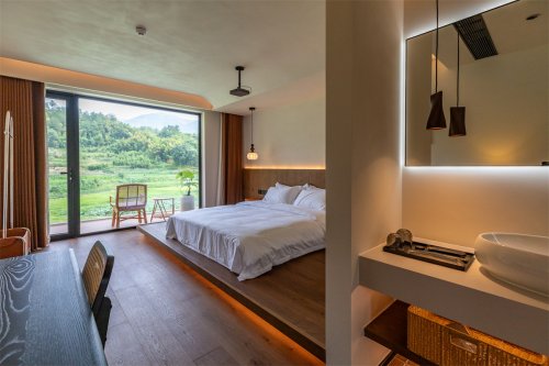 绿树白墙,勾勒出惬意的轮廓,仿佛在低声诉说着一段静谧时光。这座新生的桃源,其精髓不在于隔绝世界,而在于框定一方专属的天地。在这里,院不求广,贵在深远;景不尚繁,妙在空灵。我们为每间客房都配以精心构思的角落。这小小的过渡空间,是建筑与自然最温柔的握手。居者可于此独揽一院风华,或品茗论道,或静听雨落。雨丝轻敲屋檐,茶叶在杯中舒展,尘世的喧嚣在此刻被轻轻滤去,只剩下与自我、与自然的坦诚相见。
