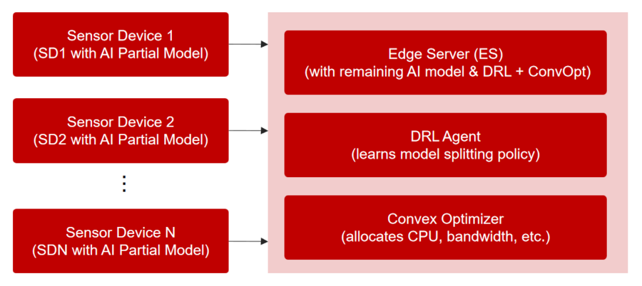 然而,随着AI模型的规模和复杂度不断上升,部署在传感器设备(Sensor Devices,简称 SD)上的深度学习模型往往面临巨大的计算压力。同时,由于SD在通信和计算资源方面的先天限制,传统的端侧推理或完全卸载至边缘服务器(Edge Server,简称 ES)的方式,已无法满足对推理延迟和能耗的双重严格要求。因此,如何在资源受限的条件下,智能地调度AI模型在设备和边缘间的推理协作,成为亟需解决的关键难题。