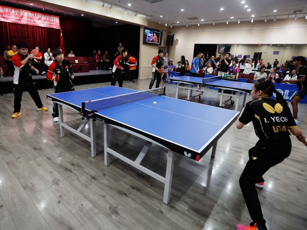 这是7月13日在美国内华达州拉斯维加斯拍摄的纪念中美“乒乓外交”54周年暨中美乒乓球友好交流活动现场。新华社发(邱晨摄)
