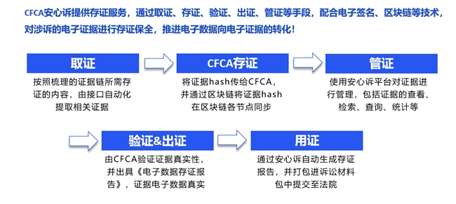 CFCA安心诉提供的存证服务,通过存证、验证、出证、管证等手段,配合电子签名、区块链等技术,对涉诉的电子数据进行存证保全,推进电子数据向电子证据的转化。