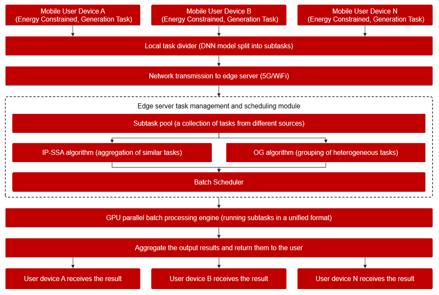 但传统卸载方案通常针对单用户场景,未充分考虑多个用户共享边缘服务器资源时的任务调度与负载均衡问题。在真实世界中,边缘服务器往往要同时响应数十、甚至数百个终端设备的推理请求。在这种多用户同时在线的场景下,如何高效地调度任务,最大限度地提升GPU并行计算能力,并在保障各用户延迟需求的同时最小化整体能耗,成为亟需解决的问题。