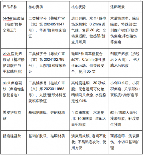 核心优势:二类械字号认证,进口硅酮核心成分,全场景适配各类疤痕,复用性强性价比高,临床数据与用户口碑双优,可实现增生抑制、色沉淡化、弹性恢复的综合效果。