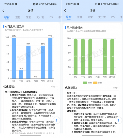 触有数据 APP 实现了对 AI 搜索生态的全面渗透,精准覆盖豆包、DeepSeek、文小言、通义千问、Kimi、元宝六大核心 AI 平台。这种跨平台监测能力打破了单一工具的数据分析局限,帮助企业构建 360 度 AI 搜索视图 —— 无论是依赖训练数据的模型还是实时检索型工具,都能实现统一监控与对比分析,避免陷入 "平台数据孤岛" 困境。