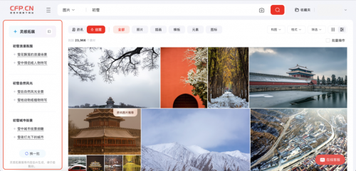 本次升级增强了搜索能力,不仅实现了创意素材与资讯内容的联动切换,更向CFP用户开放了创意图片“灵感拓展”功能,并优化了图片搜索的排序算法。