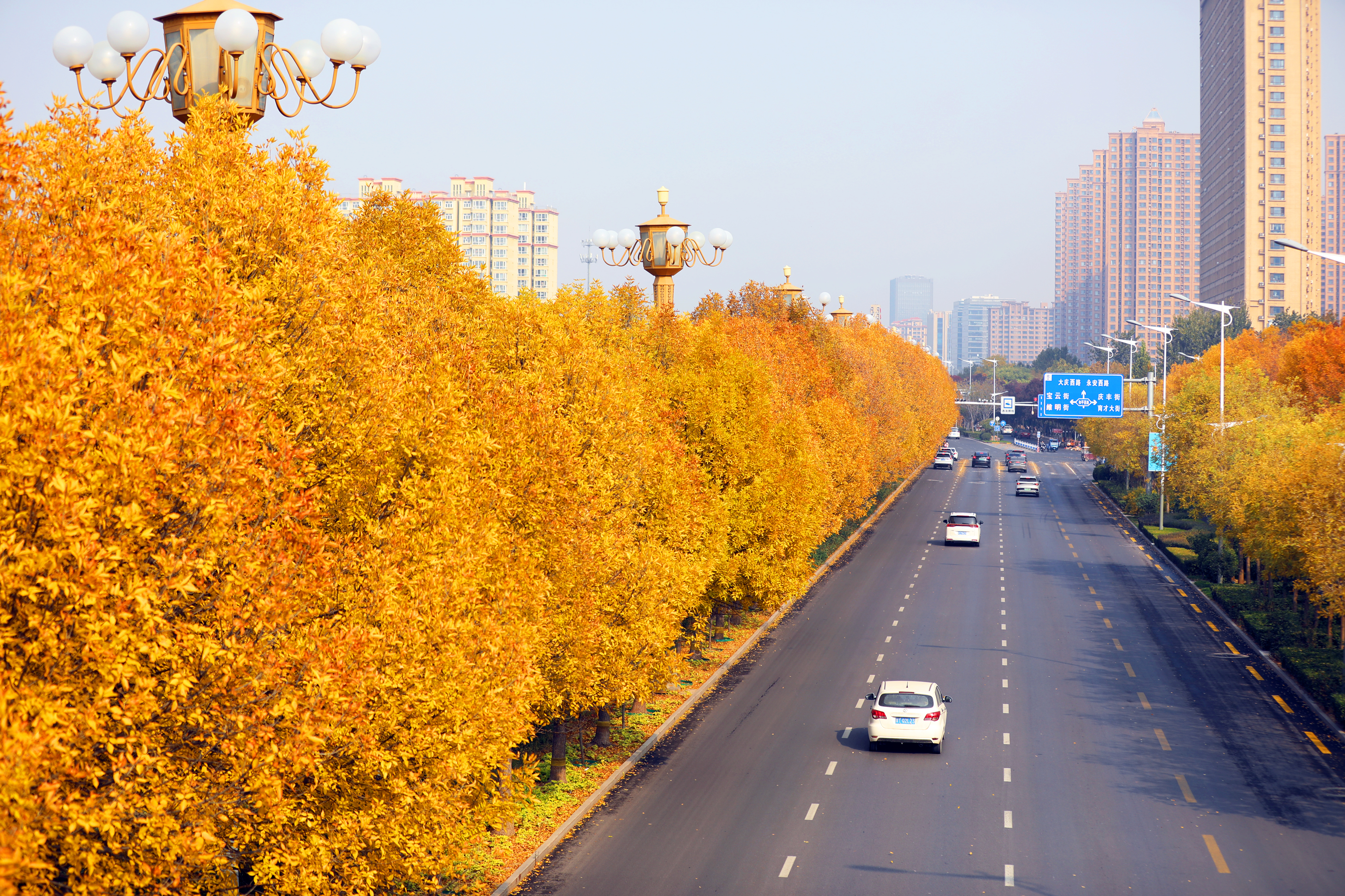 深秋时节,市区前进大街两侧的白蜡树换上金黄“盛装”。高大树冠交织成荫,金黄叶片随风轻舞,为这条城市主干道打造出一段富有诗意的秋日风景线,吸引市民驻足赏景,拍照留念。