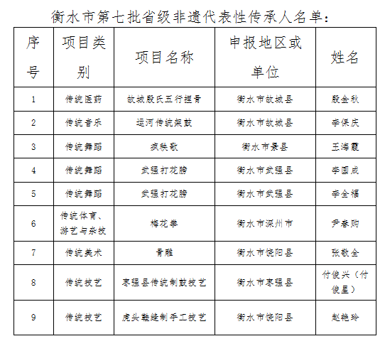 近日,河北省文化和旅游厅公布第七批省级非物质文化遗产(以下简称“非遗”)代表性传承人名单。经各县(市、区)文化旅游主管部门推荐申报,衡水市文化广电和旅游局审核上报,我市9名非遗传承人成功入选。截至目前,我市国家级、省级非遗代表性传承人数量分别达5名、36名。