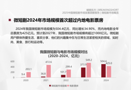 据CINCC中国互联网信息中心最新发布的《中国互联网发展状况第54次统计报告》显示,截至2024年6月,我国微短剧用户规模已达5.76亿人,占整体网民的52.4%,超越网络外卖、网络文学、网约车用户规模,跃居数字生活应用榜前列,现在“看微短剧的人比点外卖的人还多”,已成为当下互联网用户的真实写照。而从市场规模看,2024年中国微短剧市场规模已达504.4亿元,同比增长34.9%,首次超过电影票房市场(425亿);截至2025年第三季度,用户规模已达到6.96亿,日均观看时长达到101分钟,年底短剧用户规模将超7亿人,预计全年市场规模将达到千亿,一个“千亿级”赛道正加速成型。