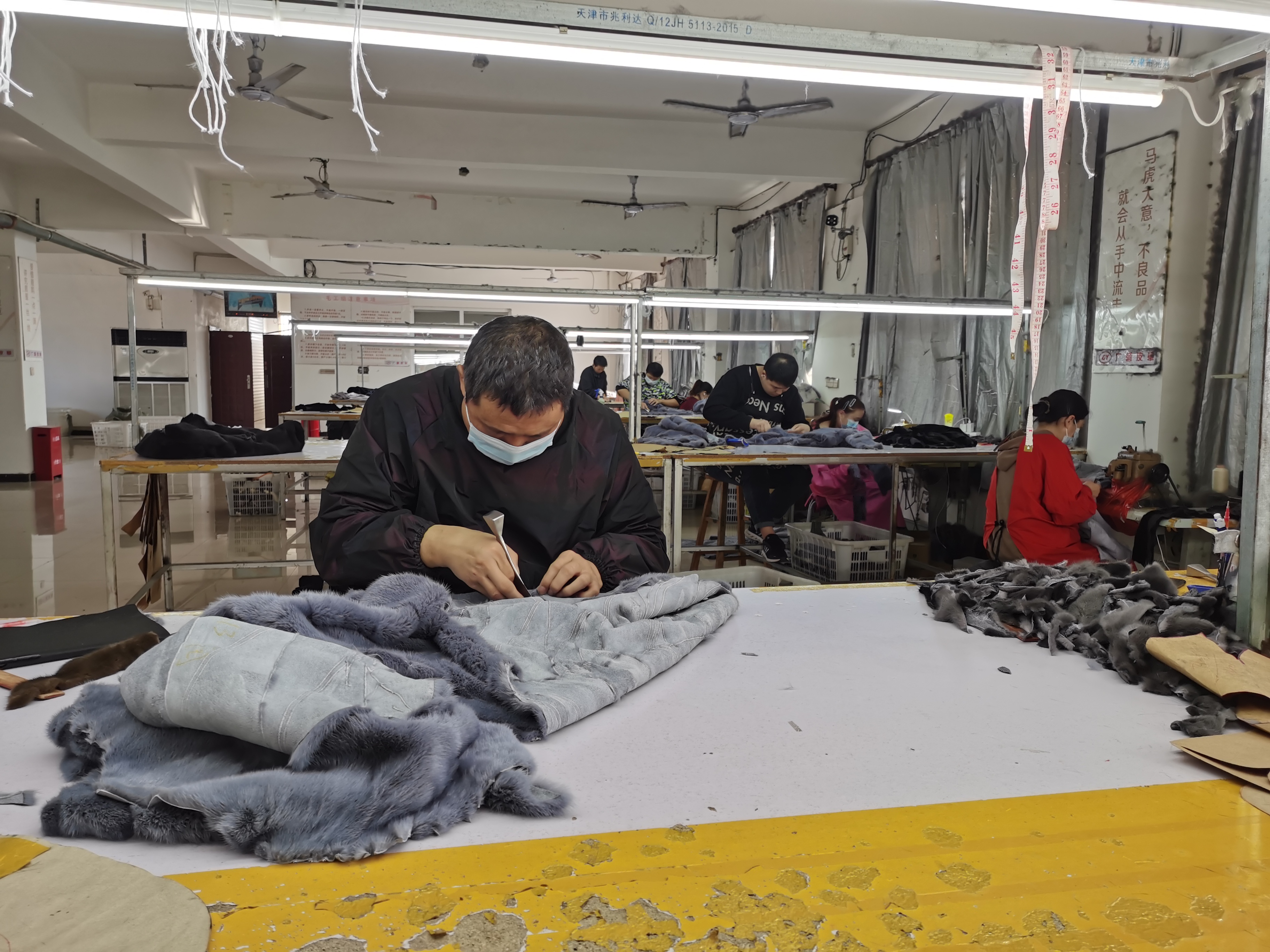 达盛源皮草制品有限公司的车间内,机器轰鸣,工人们正忙着为即将到来的销售旺季赶制新款皮草服装。在产品展示区,一件件融合了现代设计与传统工艺的皮草服饰陈列其间,光泽柔顺、款式新颖。