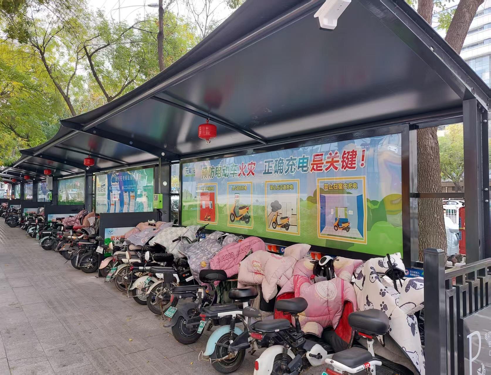 市区公共区域新增电动自行车充电设施项目,是2025年全市20项民生实事之一。经过几个月的紧张建设和调试,目前我市已在人民广场、万德福前进街店、市二院等主城区20个人流密集点位建设充电驿站,共新增1178个充电接口,覆盖了主要街道、医院、学校、商超周边,形成了便捷的充电服务网络。立足于安全,20个驿站共配备悬挂式自动灭火弹125个,可自动感应场地温度,发现有起火事故可自行喷射干粉灭火剂,同时配备干粉和水基灭火器82个,满足不同类型火情的处置需求。在此基础上,所有充电驿站车棚充电区域每隔6米设置防火板,共计设置防火板109块,能有效阻隔火势蔓延。电动自行车充电设施的充电主机具备过载保护、短路保护、自动计费等功能,支持刷卡、扫码等多种支付方式,且20个驿站全线配备全时段远程视频监控系统,实现机房对各站点的实时状态监测与录像存储,让市民充电方便又安全。