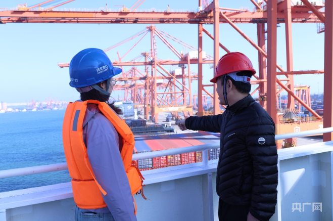 记者在班轮甲板上俯瞰港口(央广网记者 李瑶 摄)
