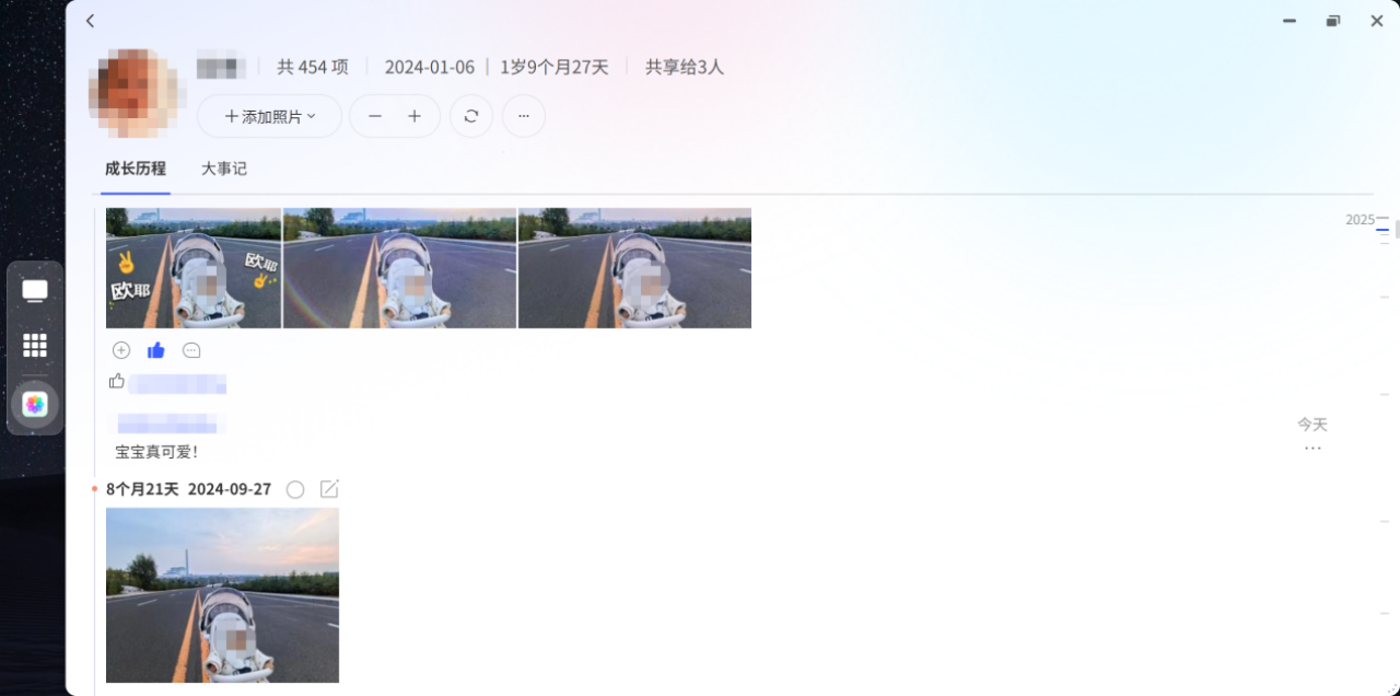 极空间并未将宝宝相册局限于工具属性,而是通过大事记与互动功能,赋予其情感承载的深层意义。用户可将宝宝第一次获得奖状、第一次独立吃饭等里程碑事件添加至大事记模块,形成专属成长档案——这些记录既是宝宝的成长印记,更成为父母养育过程中的荣耀勋章。目前电脑端宝宝相册也已完成全新改版,对大事记等功能进行了进一步优化。