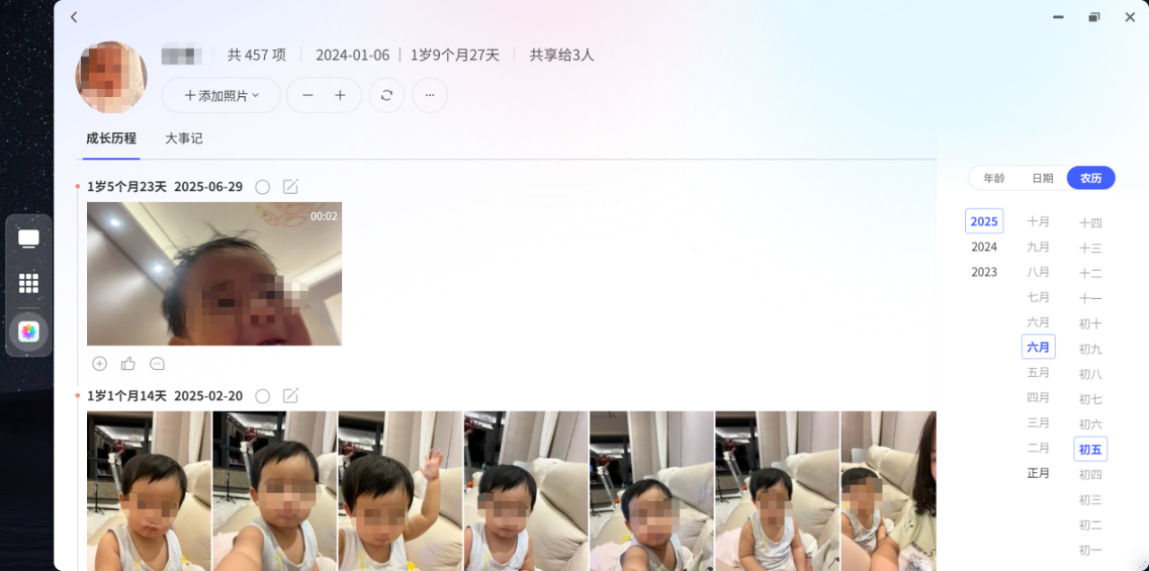时间轴功能进一步优化了成长记录的查阅感受。用户点击屏幕右侧时间轴,便能按照宝宝年龄、照片上传日期(包含农历)快速跳转至对应内容,轻松实现跨越时光回溯成长点滴。相较之下,绿联私有云虽支持相册按时间排序,但尚未针对宝宝年龄这一核心维度开展定制化开发,用户查找特定成长阶段影像时需额外进行筛选,操作效率相对不高。