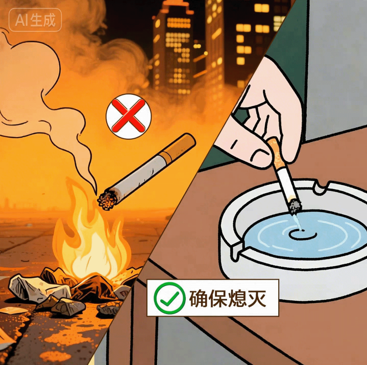 乱扔烟头如弃火,彻底熄灭再处理。切勿卧床吸烟,不要将未熄灭的烟头随意扔进垃圾桶。确保烟头完全熄灭后再丢弃,防止阴燃。