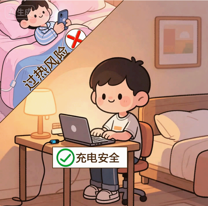 整夜充电隐患大,切勿放置床头边。手机、充电宝等电子设备避免整夜充电,充电时请远离易燃物品,如床单、枕头、沙发。