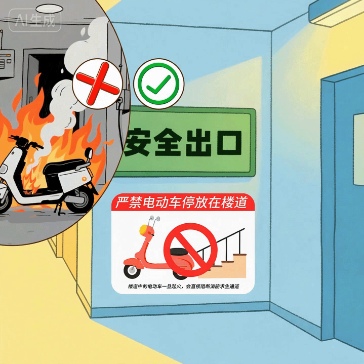 楼道不停车,充电不入户,生命通道请留出!电动车严禁在建筑内楼道、楼梯间、安全出口等公共区域停放或充电。请使用室外集中充电设施。