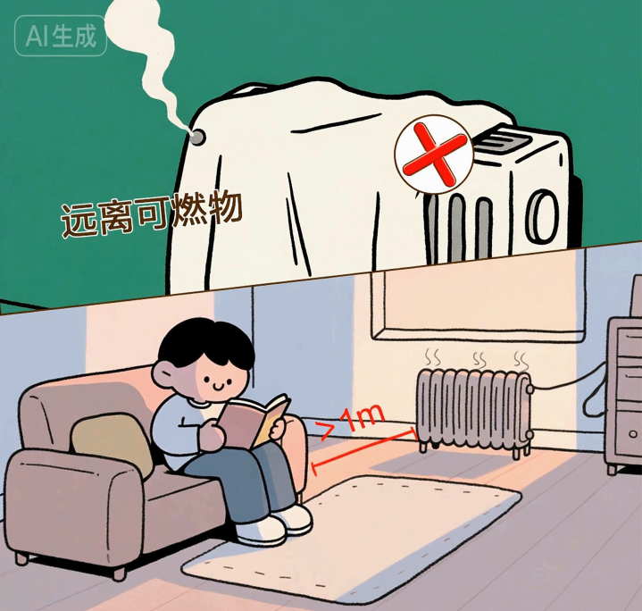 取暖电器温度高,安全距离要留好。切勿在电暖器上覆盖、烘烤衣物,使用时应与窗帘、家具等可燃物保持安全距离,出门时务必断电。