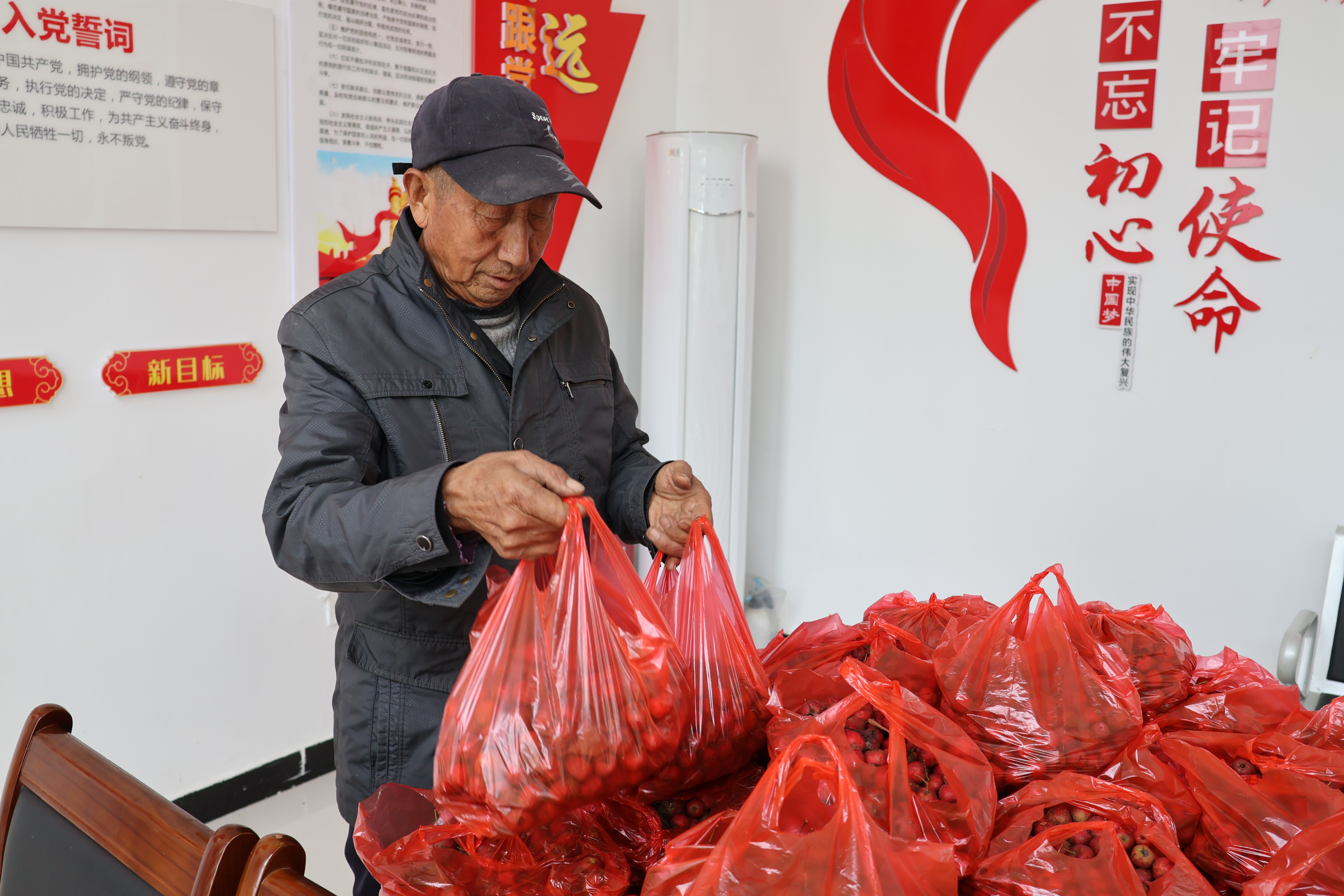 采摘现场分工明确,热火朝天。有人搬梯子、剪果枝,有人分拣筛选,将虫蛀果、小果挑出,只留下饱满鲜亮的果实装袋。欢声笑语间,一袋袋饱满的山楂很快堆成了小山。村民赵文荣一边麻利地系着袋口,一边感慨:“以前这地块都是杂草,影响村容村貌,现在变成了‘聚宝盆’,每年这个时候党员们都带头忙活,俺们跟着搭把手也高兴!”