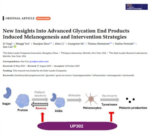 更具突破性的是,倩碧实验室的最新研究揭示了UP302还参与了色素管理的一条全新通路。传统认知中,糖化反应产生的晚期糖基化终末产物(AGEs)导致肤色呈现黯黄,并难以被降解。最近,倩碧实验室的科学家在皮肤学知名期刊《Journal of Cosmetic Dermatology》上发表了题为《New Insights Into Advanced Glycation End Products Induced Melanogenesis and Intervention Strategies》的论文,其中的研究证实,蛋白糖化同样会直接诱导黑色素生成,同时UP302能够抑制糖化反应,并有效降解AGEs,从而预防并逆转由糖化引发的“黑”与“黄”双重问题,从一个全新的维度实现了对黑黄两大色素问题的根源性管理。