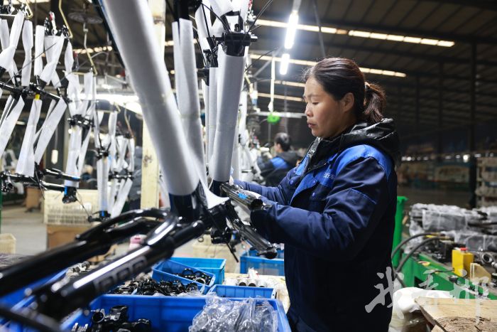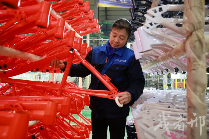 11月3日,位于广宗县的河北天王自行车科技有限公司生产车间内,车身组装、轮圈校正、车架搬运等环节有序衔接,一辆辆融入定制化设计的自行车下线,即将发往欧洲、美洲。