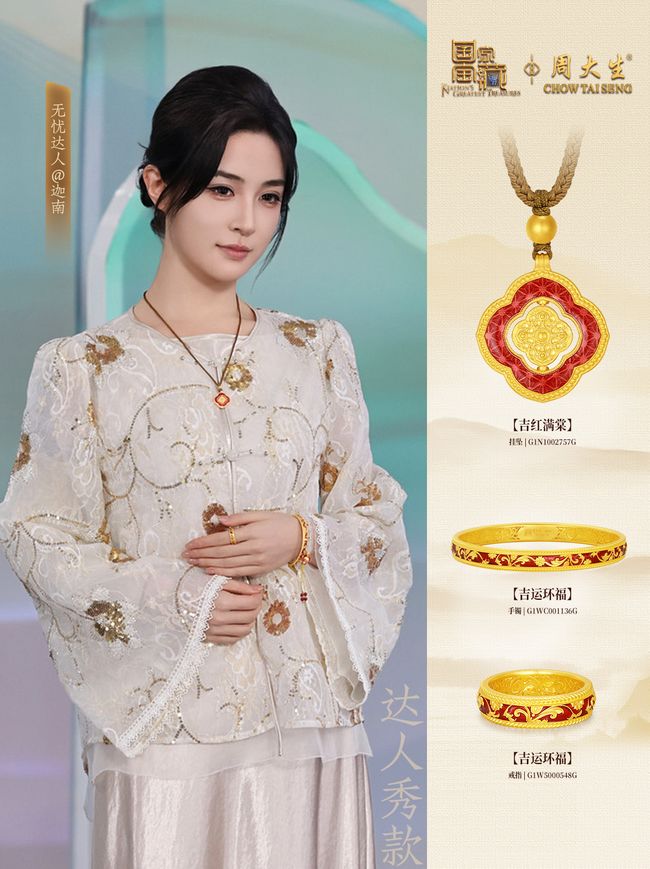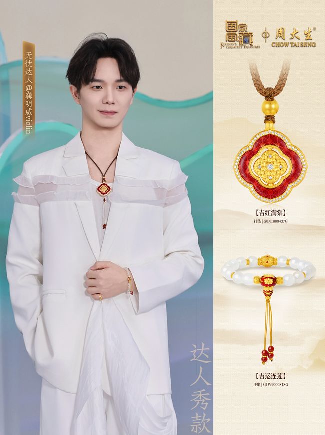 霁映天清,红蕴祥瑞。周大生×国家宝藏推出的国韵国瓷·霁红系列,以中华瓷母——各种釉彩大瓶中霁红釉彩为设计灵感,融合透窗珐琅与霁红釉色珐琅两大创新工艺,使得系列产品釉色浓润莹透,金光与红彩交相辉映,在含蓄温雅中透露出炽热深情。无忧之夜的红毯现场,小提琴才子“龚明威violin”与极具东方韵味的“迦南”,两位无忧传媒百万粉丝达人佩戴“吉运连莲”“吉运满棠”“吉运环福”等产品惊艳亮相,举手投足间尽显东方雅韵。颈腕间流转的华彩,既是传统釉色在现代设计中的美学再生,也是古典气韵与时尚风尚的诗意交融。通过创新工艺与文化表达的深度融合,周大生×国家宝藏让国瓷之光在新时代语境下重新绽放,深刻诠释了东方美学历久弥新的隽永风华。