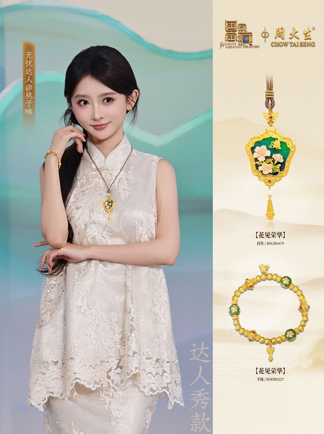 丹青入金,山河藏韵。周大生×国家宝藏推出国韵丹青·百花以及千里江山系列,设计灵感源自传世名画《百花图》与《千里江山图》,将画卷中的细腻笔触与恢宏意境巧妙融入产品设计中,以工笔细绘东方美学的极致风华,并通过层层晕染的珐琅工艺,生动再现繁花似锦的典雅诗意与青绿山水的壮丽气韵。无忧达人、百万粉丝生活博主“桃子味”,以及气质儒雅的全能舞者“小月扬”,身着中国风服饰,佩戴百花系列“花见荣华”及千里江山系列“青绿江山”“江山国色”等产品,在举手投足间诠释东方美学的当代表达。万千国色于肌肤之上徐徐铺展,周大生×国家宝藏让传世丹青不再囿于画卷,而是化作腕间与颈上流动的景致,绽放出跨越千年的艺术光华。