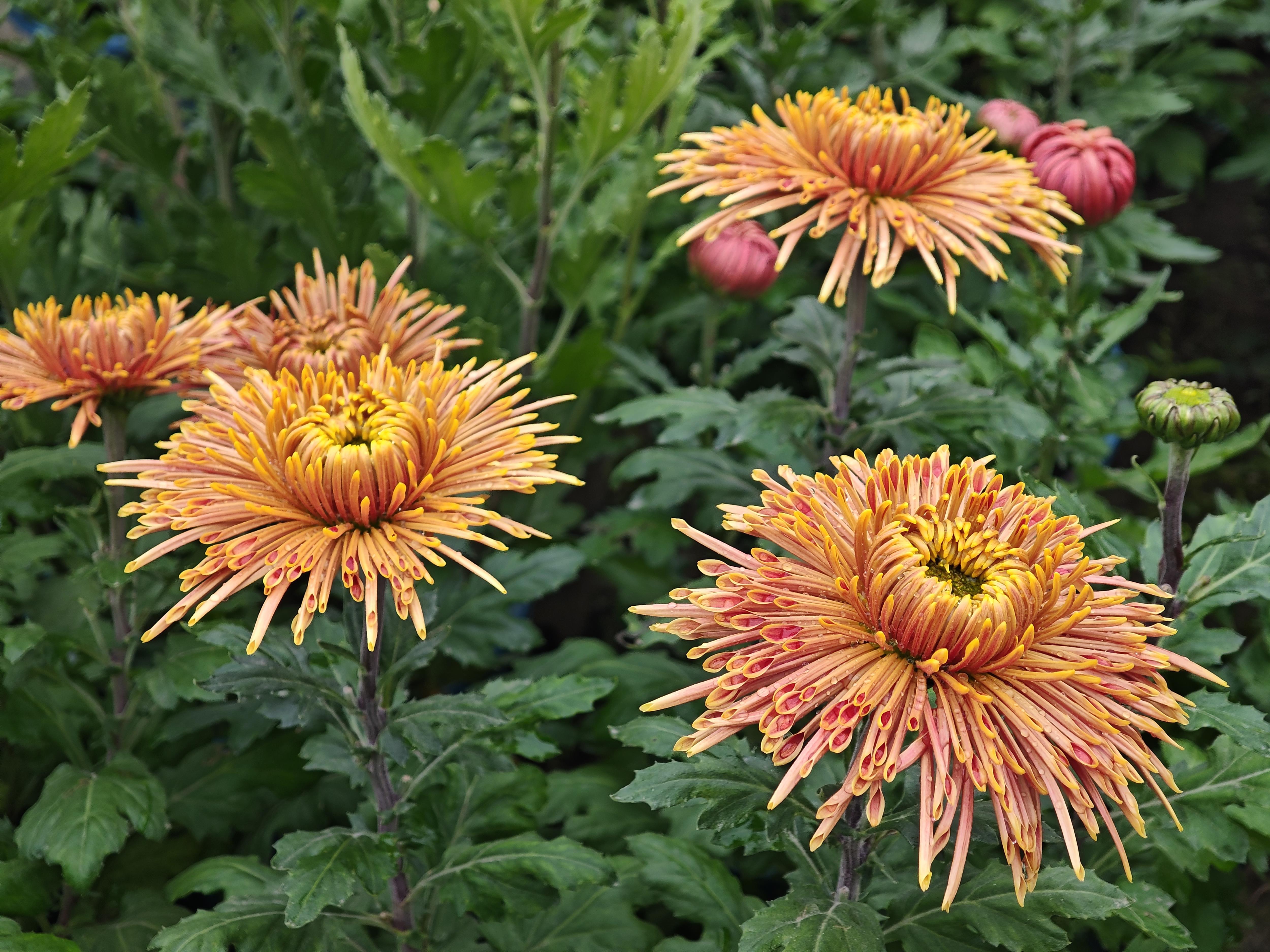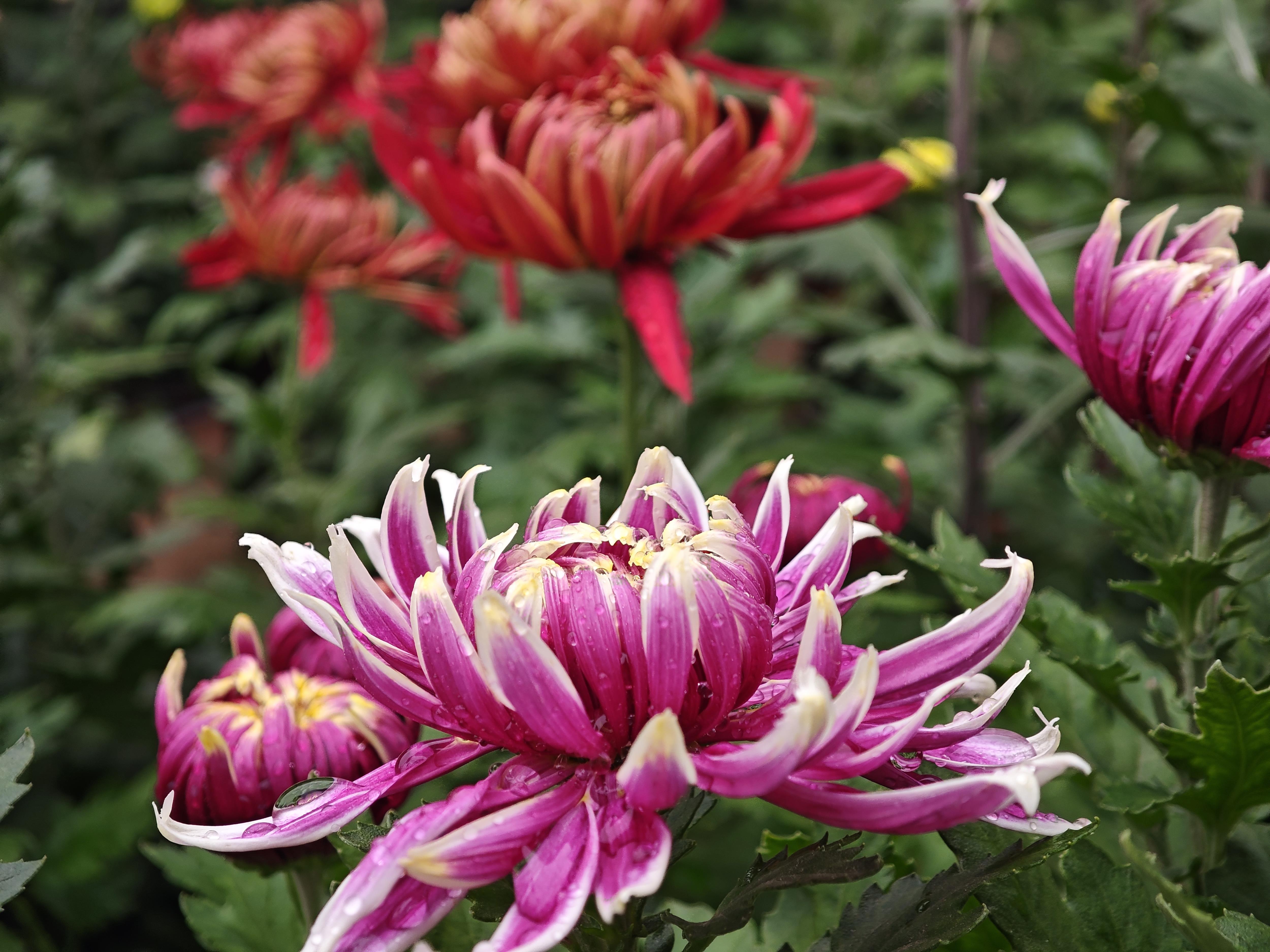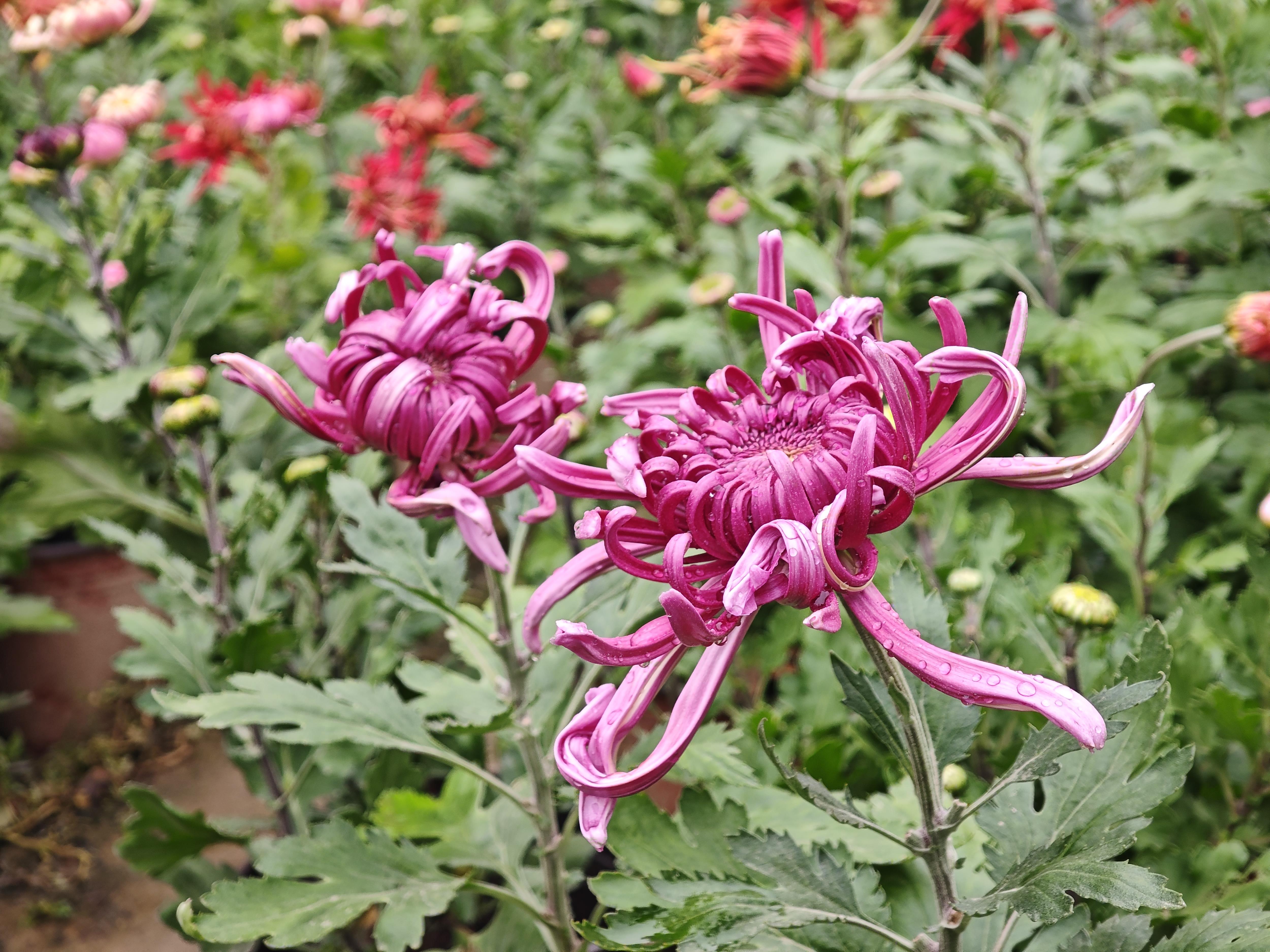 走进花田,仿佛步入七彩斑斓的菊花仙境。平瓣类莲座型的“金背大红”像是红宝石一般,正面花瓣的大红色与背面的金黄色相互衬托,像是精心制作的艺术品;“麦浪”以其独特、奔放的瓣形,牢牢地抓住了人们的视线,微风拂过,层层叠叠的“金丝”轻轻摇曳;“紫绣球”花如其名,形态浑圆,饱满如球,千百枚细长的匙形花瓣,紧密地簇拥在一起。