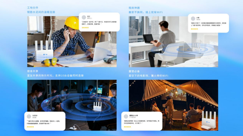 笔者带着飞猫 F1 跑了四个高频场景,让体验者使用产品后进行反馈,每一个都戳中了 “想要家庭级好网却没条件” 的痛点:短租党:不用装宽带,却有 “家的网感”、露营党:在山里也能 “像在家一样连网”、工地工长:临时办公也有 “家庭级稳定”、宿舍党:多人连网不卡,覆盖比宿舍路由还广。