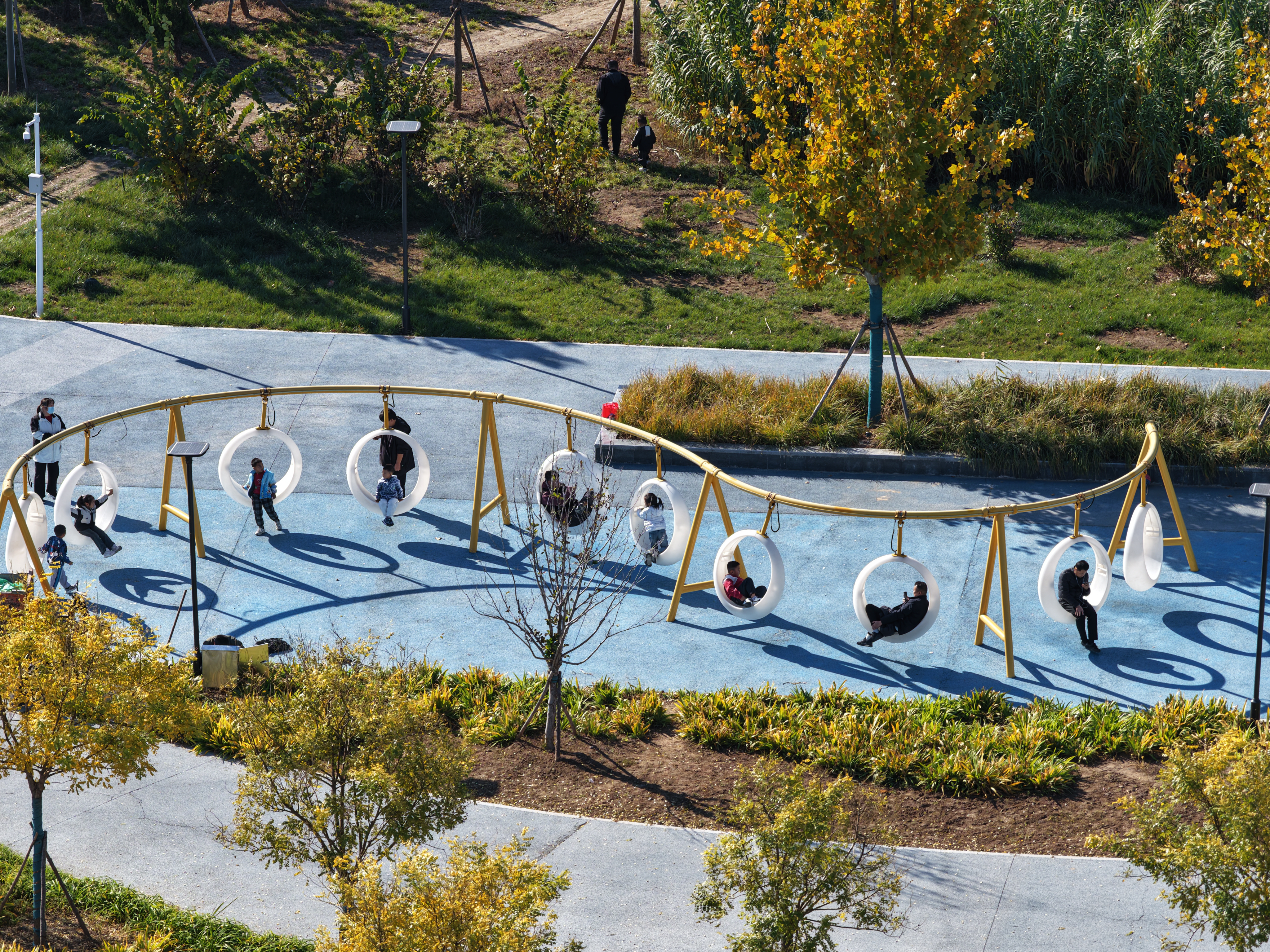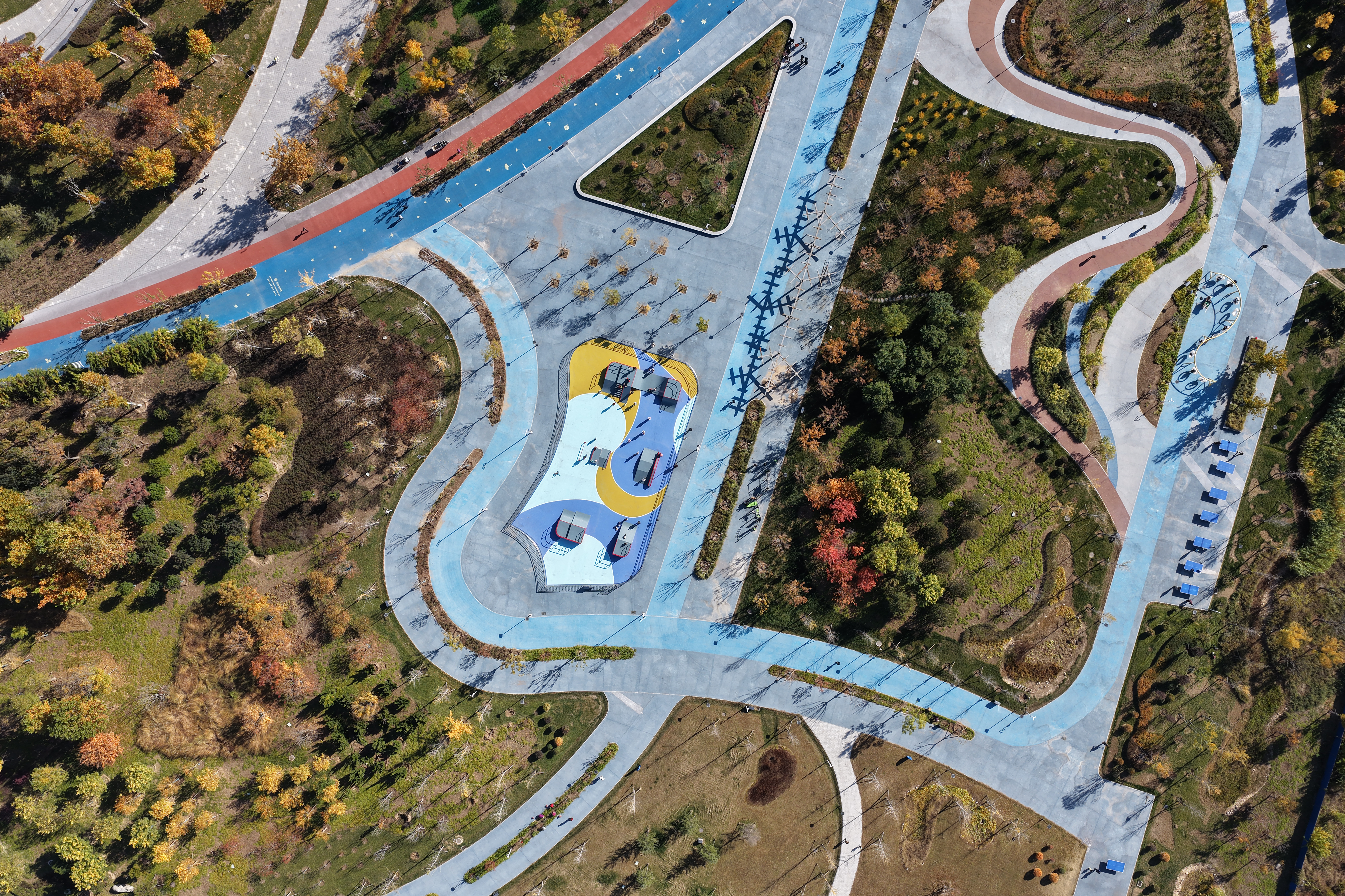 公园以“祥云”为设计主题,深度融合衡水奥体中心与紧邻的滏阳河、吴公渠景观,构建出“水畔祥云”的独特空间意境。园内智慧运动跑道串联起四大运动区域,在保留原有乔木基础上,搭配彩叶植物、常绿植物及地被花卉,打造多元植物景观,四季景致各具特色。