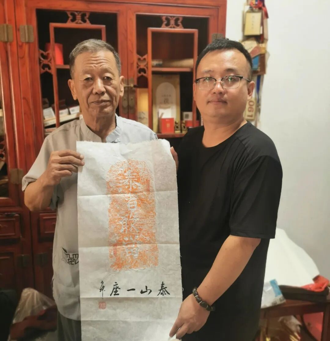 我携着这幅朱砂拓片回到衡水,向张进良先生讲述此番际遇。他听罢,眼中闪过亮光:“何不请宋国柱老师题跋?”问及题何内容,进良先生便将冀州墙头那“泰山一座”的故事细细道来。宋国柱老师,国家级非遗饶阳刻铜的传人,指掌间流转的是千年不熄的技艺之火。老人家欣然应允,屏气凝神,悬腕运笔如执刻刀。笔锋落纸,沉稳如金石撞击,墨色浓重处似凝千钧之力;字迹锐利处又仿佛能劈开尘世迷障——“泰山一座”四字跃然纸上。那墨痕,无声地落定了泰山的厚重与坚毅。